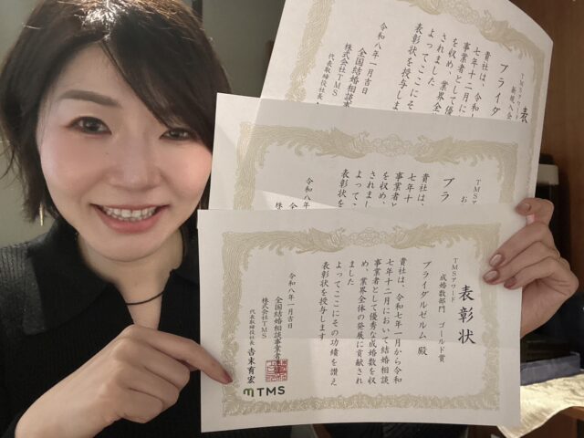 今回の表彰は、会員様、そして日頃ご縁をつないでくださっている他相談所の仲人の皆さまのお力添えがあってこそだと感じています。